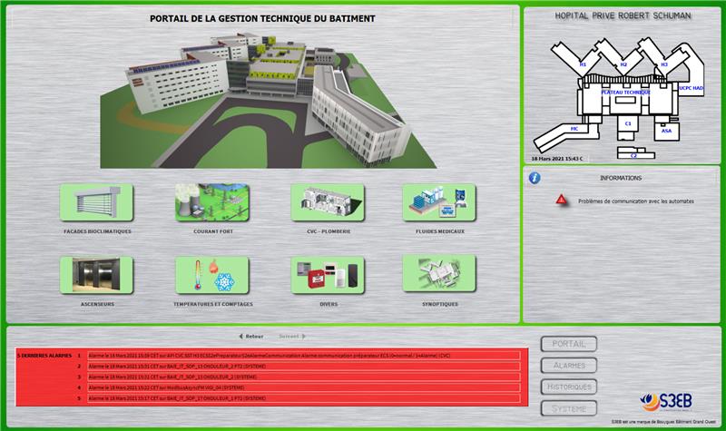 Prestations Dans le cadre de la construction d’un hôpital sur le site de Lauvallières : GTB : supervision des lots techniques (CVC, CFO, Fluides médicaux). Automates et serveurs Web. Gestion des façades bioclimatiques : fourniture et mise en œuvre d’un système de Shadow Management et de pilotage de brises soleil orientables, châssis COLT et d’un mât météo. Coordination GTB inter lots technique Mission d’accompagnement de 24 jours durant le parfait achèvement. Dans le cadre de l’agrandissement de l’hôpital : Extension de la GTB aux nouveaux bâtiments Gestion des façades bioclimatiques : ajout de 248 brises soleil orientables et 24 châssis COLT