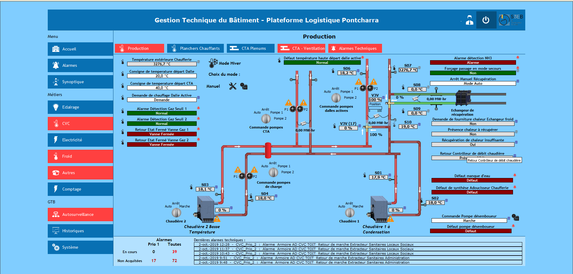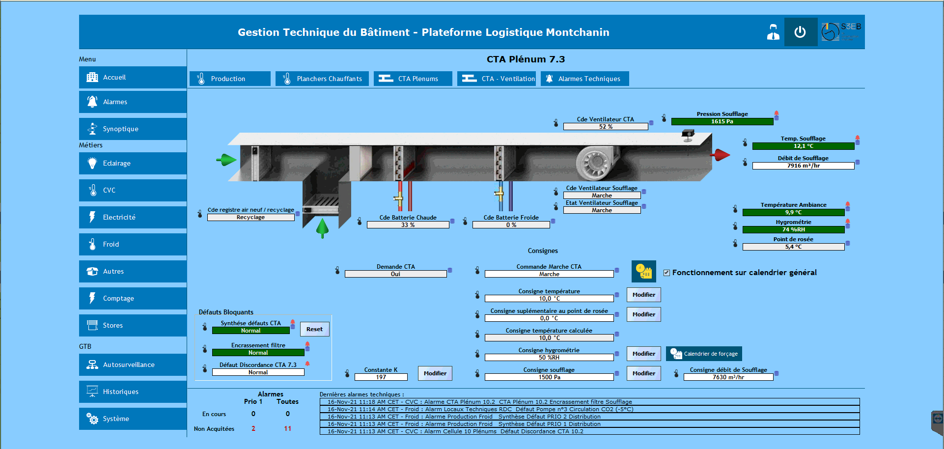 Prestations : Réalisation d’une GTB dans le cadre de l’extension et la modernisation d’une plateforme logistique destinée au stockage de denrées alimentaires dans des chambres froides et négatives : Fourniture, pose et raccordement des automates de contrôle et de commandes, d’un automate serveur Web, de 3 écrans tactiles. Fourniture, pose et raccordement de 27 contrôleurs DALI pour l’éclairage des cellules. Développement des pages de supervision GTB. Développement de la régulation de la chaufferie, des planchers chauffants et des CTA des plénums. Fourniture de l’ensemble des capteurs (températures, luminosité, hygrométrie). Tests et mise en service de l’ensemble.
