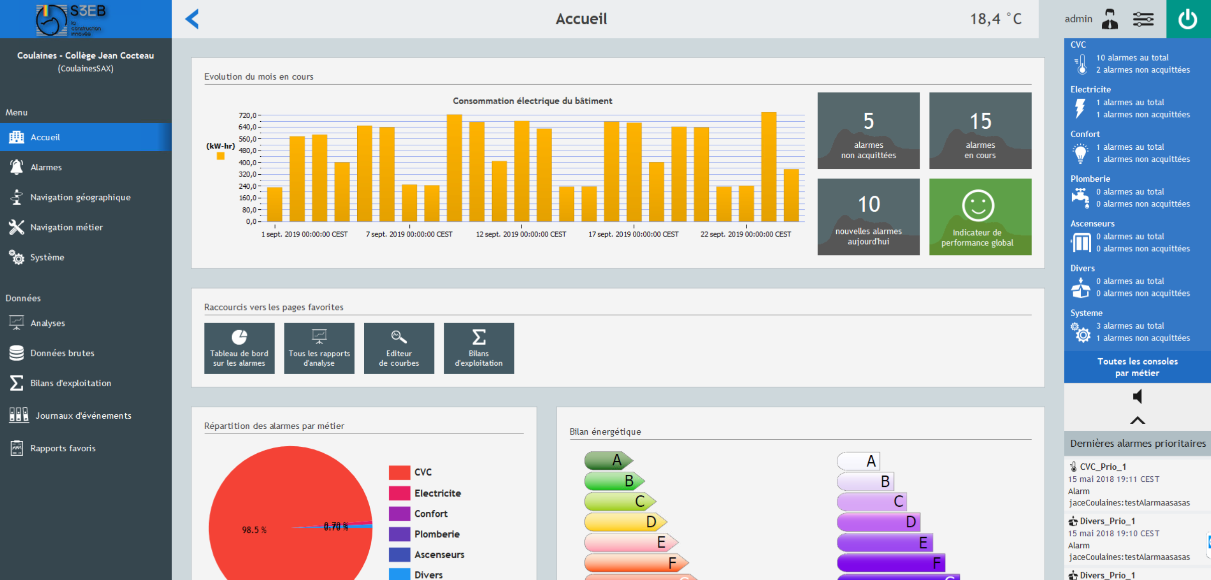 Prestations : Dans le cadre d’un Partenariat Public Privé pour la construction, maintenance et exploitation de 4 collèges dans la Sarthe, en livraison par phases, réalisation du lot GTB, afin de superviser : Les alarmes techniques Les éclairages, stores et volets roulants Le pilotage des installations CFO, CVC et plomberie La collecte des données énergétiques (eau, gaz, électricité).