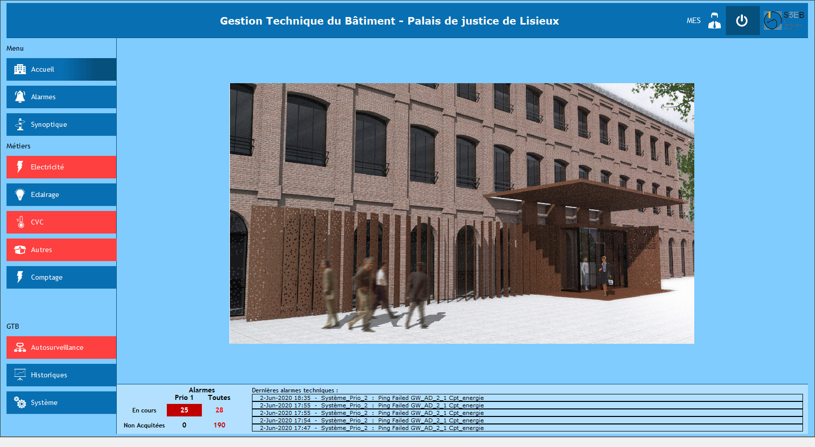 Prestations : La cité judiciaire de Lisieux est construite dans l’ancienne usine Wonder et permet de réunir le tribunal de grande instance, le tribunal d’instance, le conseil des prud’hommes et le tribunal de commerce. Dans ce cadre, S3EB a mis en œuvre une supervision pour : Le comptage Les commandes d’éclairage Les alarmes techniques La climatisation Le CVC 1 TGBT et 13 TD 2 chaudières, 3 CTA et 1 groupe froid.