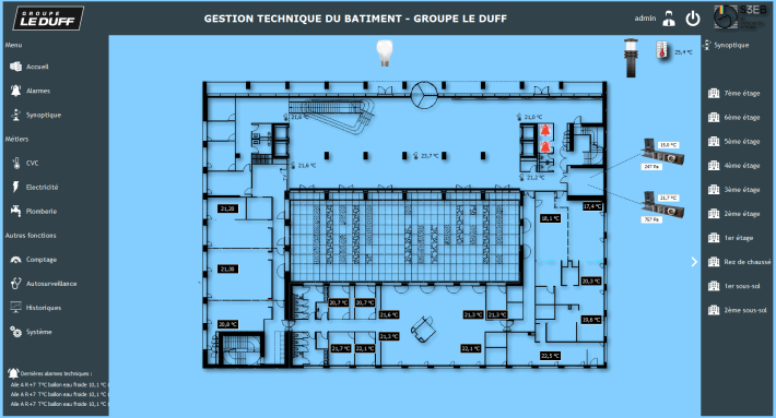 Prestations : Dans le cadre de la construction du siège du groupe LE DUFF à Rennes, supervision des installations techniques en CVC et CFO : PAC chaud, PAC froid Centrale de traitement d’air Gestion de 200 zones de bureaux Traitement de tous les comptages d’énergie Traitement des alarmes techniques.